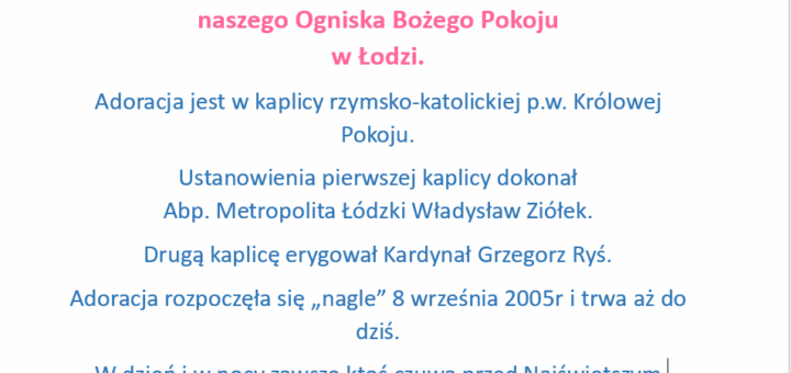 W naszym Ognisku Bożego Pokoju w Suchcicach w małej Kaplicy Królowej Pokoju znajduje się kopia obrazu Boga Ojca. Zapraszamy aby nawiedzić kaplicę, pomodlić się przed wspomnianym obrazem, polecić Bogu Ojcu wszystkie sprawy naszych serc,...