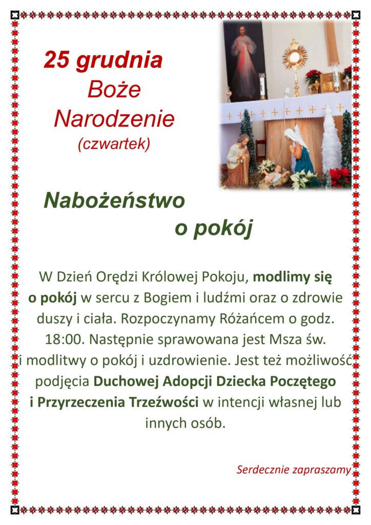 Każdego 25-tego dnia miesiąca, w Dzień Orędzi Królowej Pokoju, modlimy się o pokój w sercu z Bogiem i ludźmi oraz o zdrowie duszy i ciała. Rozpoczynamy Różańcem o godz. 18:00. Następnie sprawowana jest Msza św. i modlitwy o pokój i uzdrowienie. Jest też możliwość podjęcia Duchowej Adopcji Dziecka Poczętego (Patrz Duchowa Adopcja na naszej stronie) i Przyrzeczenia Trzeźwości (Patrz Przyrzeczenie Trzeźwości na naszej stronie) w intencji własnej lub innych osób.